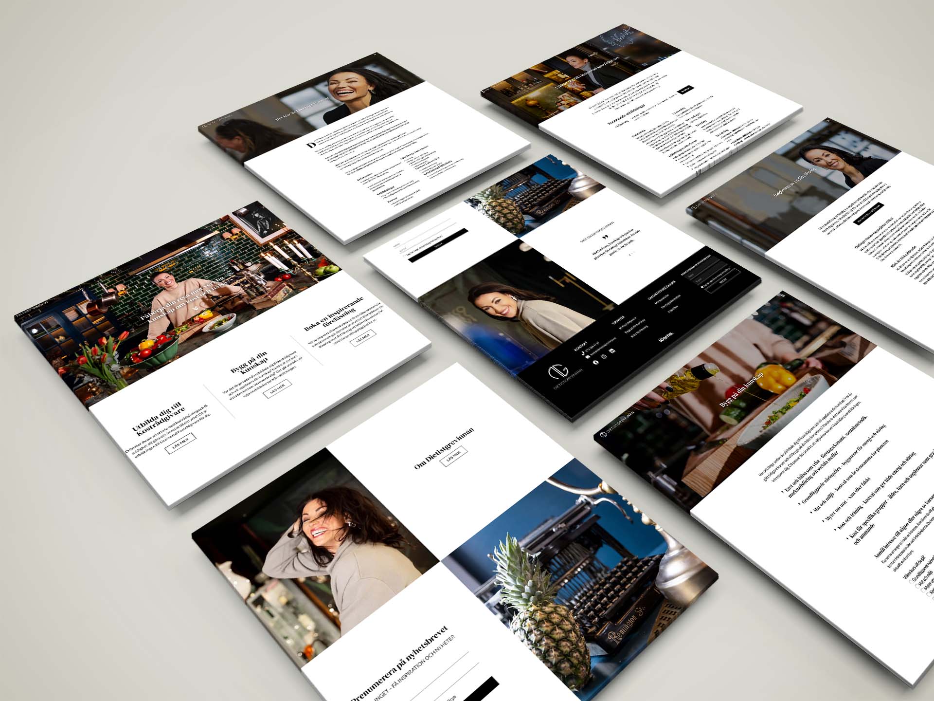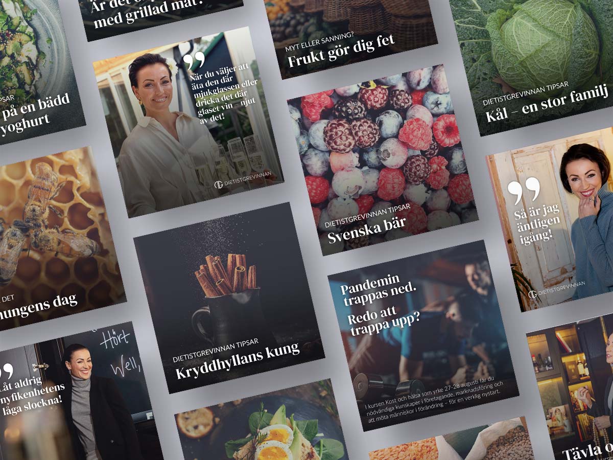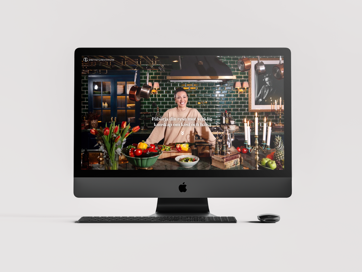 Dietistgrevinnans affärsidé är att erbjuda den mest kvalitativa kostrådargivarutbildning som finns på svenska marknaden. Detta skulle naturligtvis avspeglas i hennes marknadsföring och visuella uttryck för att ge en känsla av exklusivitet och kvalité. Tillsammans med Julia formulerade jag hennes narrativ och övergripande strategi som var vägledande för design av logotyp, webbsida, sociala medier och visuell identitet.